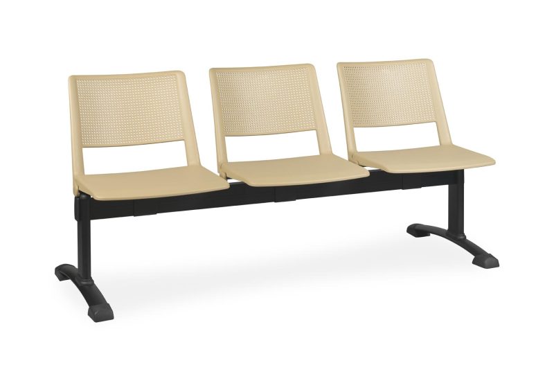 2-3-4 Y 5 plazas. Colores plástico blanco,negro,rojo,azul,verde,naranja,beige,gris. Versión asiento o asiento y respaldo tapizados con plásticos negro o blanco. Mesa. Patas cromadas o pintadas en gris.
