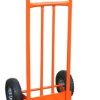 Carretilla rígida de acero con ruedas neumáticas y pala abatible. Carga máxima de 350 Kg. Muy valorada y utilizada para operaciones en almacenes.