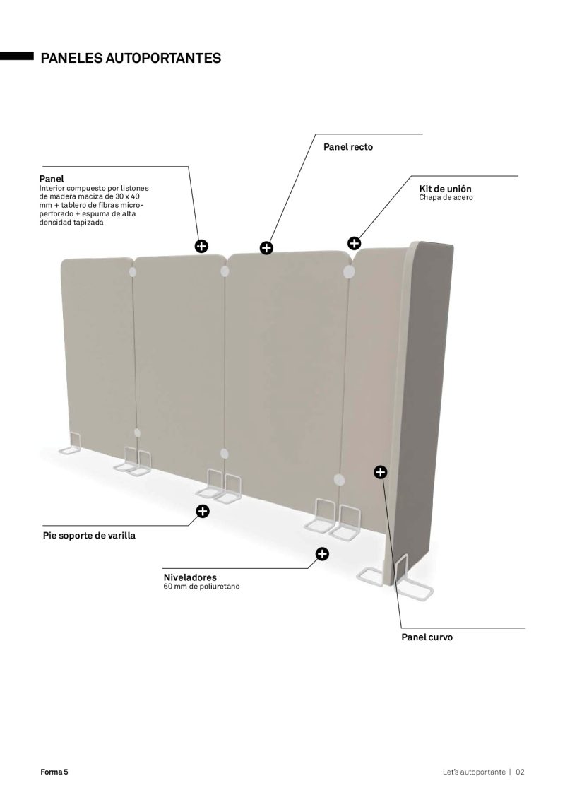 El apoyo al suelo se lleva a cabo mediante pies de varilla maciza de acero de Ø 11 mm recubierta. con pintura epoxi de 100 micras de espesor. Para crear estructuras de varios paneles existe una pieza de unión fabricada en chapa de acero y compuesta por dos círculos que se unen entre si en la parte central permitiendo que los paneles