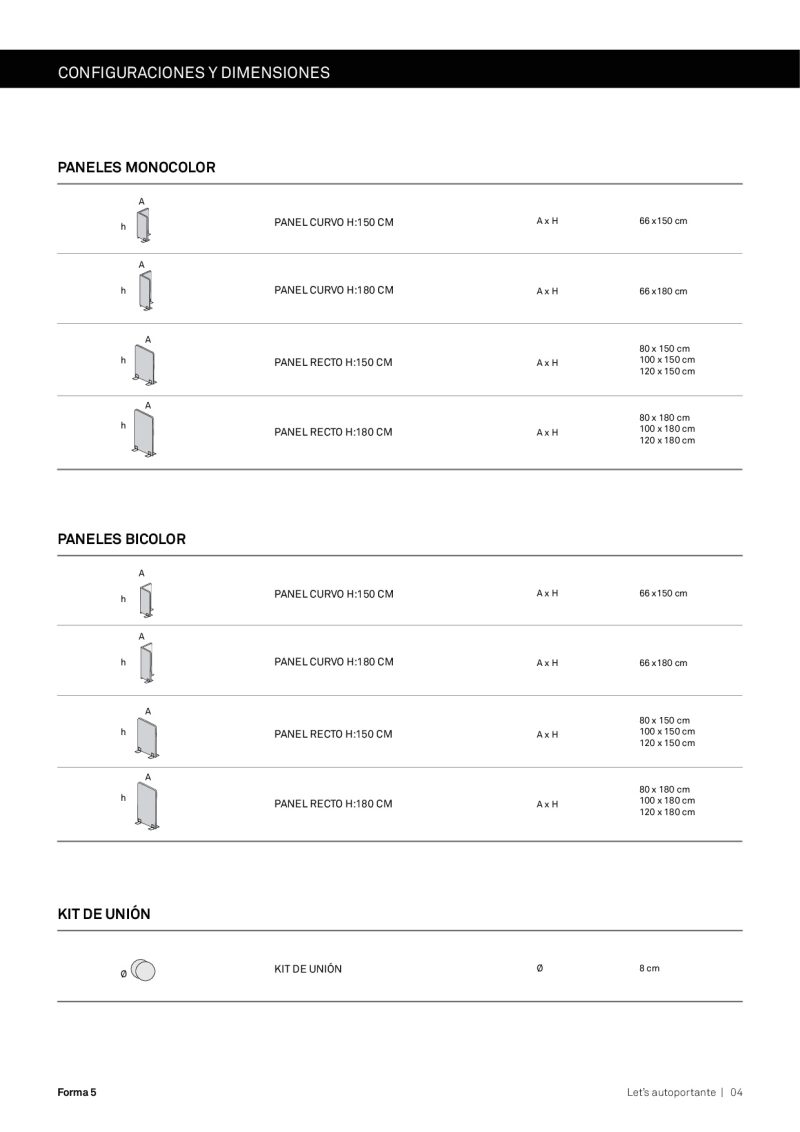 Panel curvo 66 ancho por 150 o 180cm alto. Paneles rectos 80-100 y 120 ancho por 150 o 180 de alto.