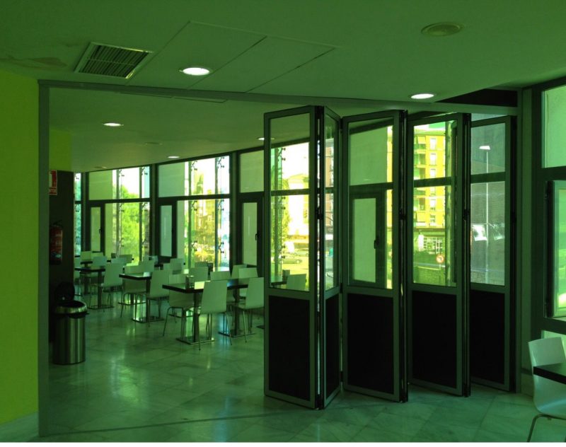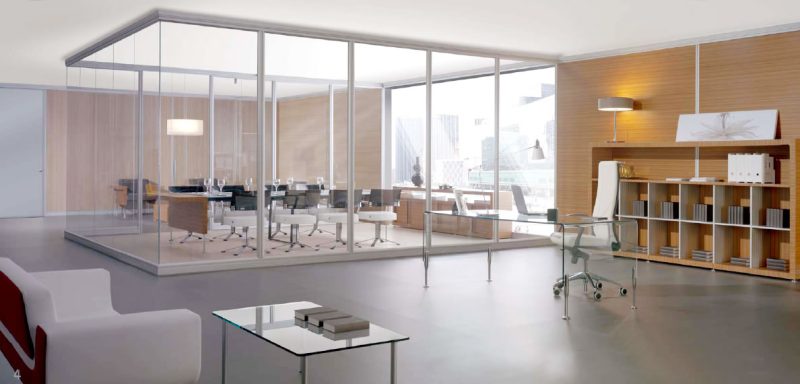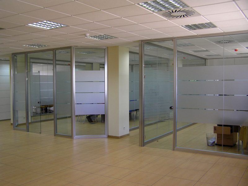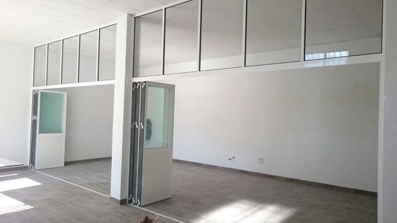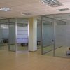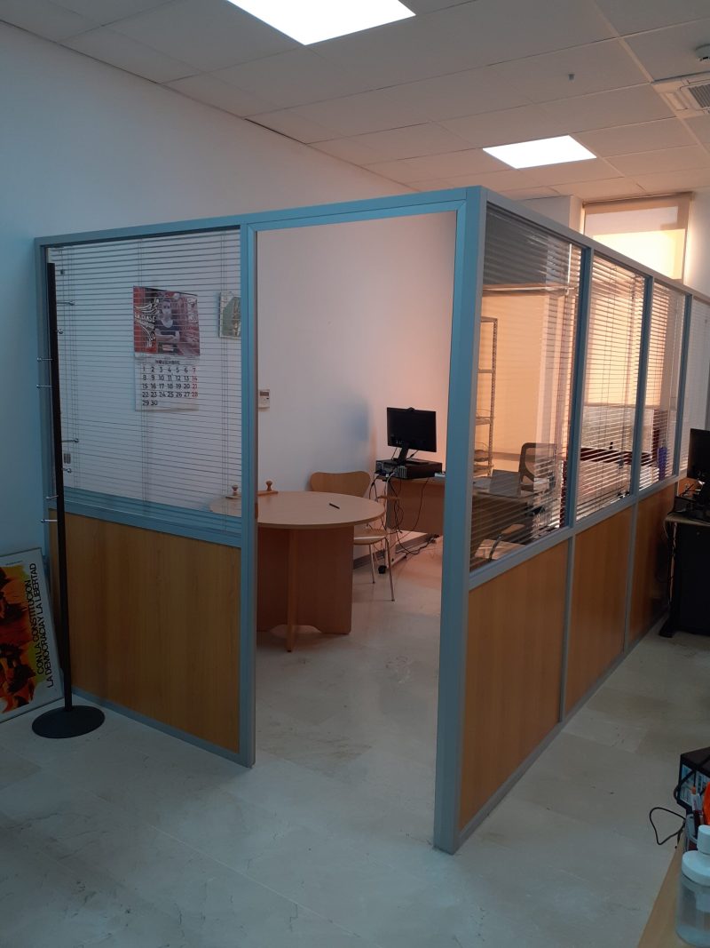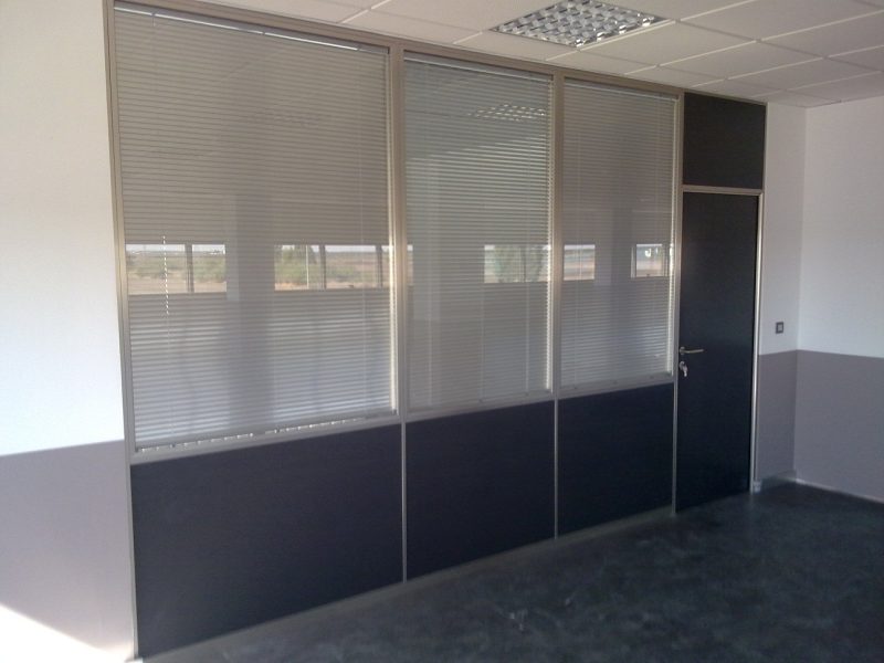 Mamparas divisorias con perfileria de aluminio y tablero de melamina combinados con cristal. Mamparas sencillas o dobles. Opción a persianas entre dos hojas de cristal.