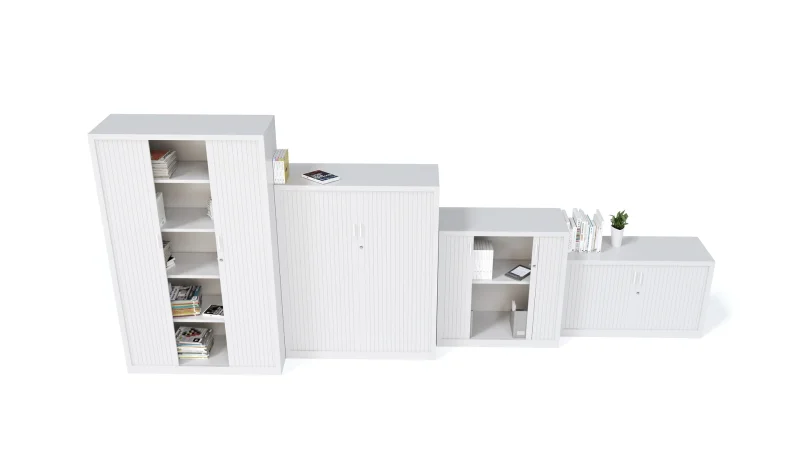 Armarios con ancho de 90 cm y altos de 195, 150, y 75 cm. Modelos sólo estantes, con puertas bajas, todo puertas,puertas correderas, con cajones de carpetas colgantes, con puertas de cristal. Cajoneras a juego.