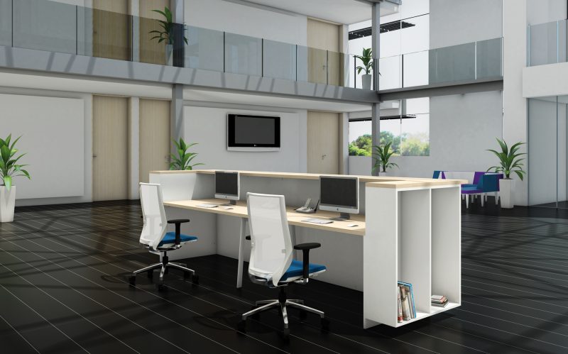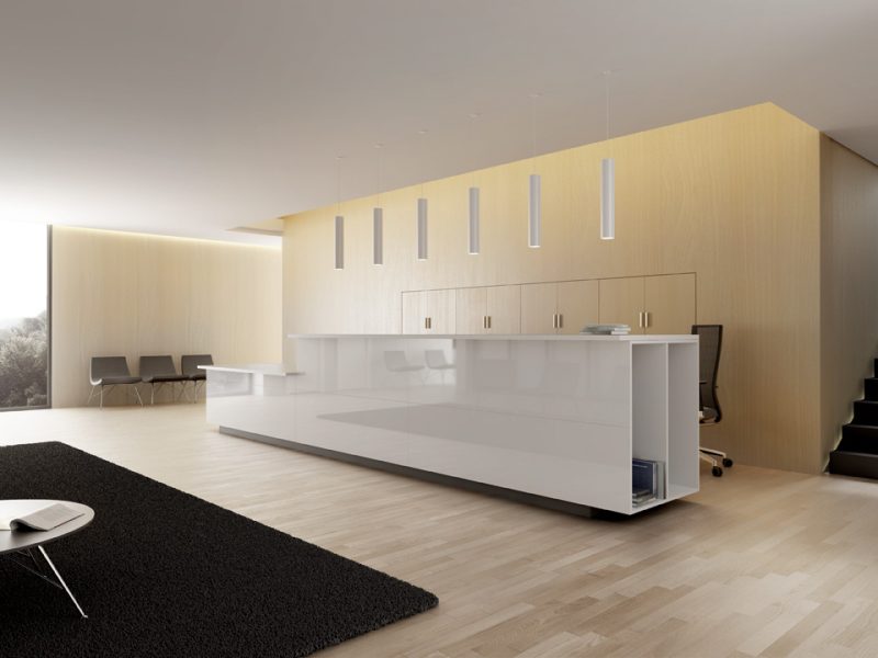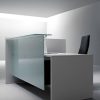 Frontalmente el mostrador queda completo con un paravent que puede ser bilaminado de 19 mm de espesor o de vidrio templado de 10 mm. La dimensión