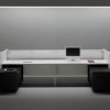 Mueble suspendido del muro y de la estructura metálica. Formado por un armazón bilaminado de 19 mm. Dimensiones: