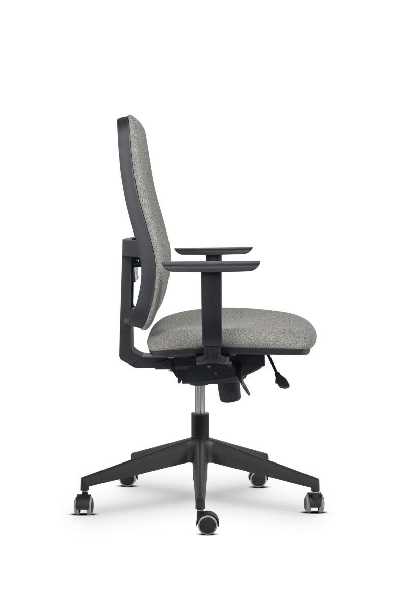 luka 1: PVC negro, respaldo tapizado, mecanismo sincron, apoyo lumbar con regulación en altura y adaptación flexible de profundidad, base negra, sin brazos