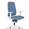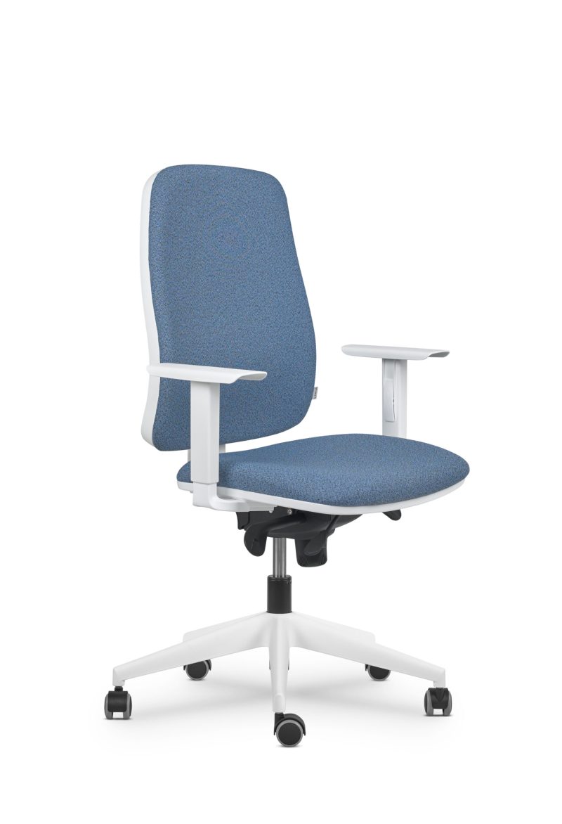 luka 2: PVC blanco, respaldo tapizado, mecanismo sincron, apoyo lumbar con regulación en altura y adaptación flexible de profundidad, base negra, sin brazos