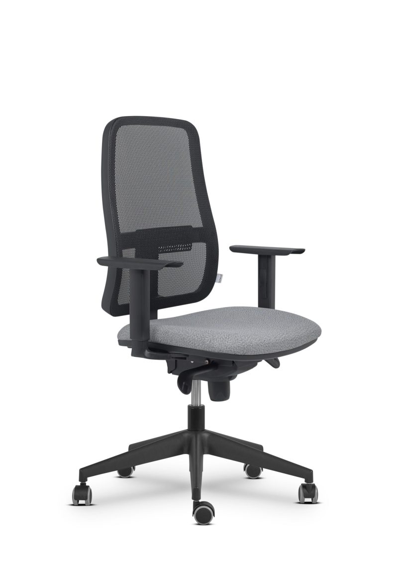 luka 3: PVC negro, respaldo malla, mecanismo sincron, apoyo lumbar con regulación en altura y adaptación flexible de profundidad, base negra, sin brazos