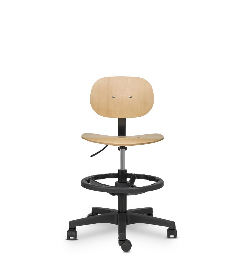 teknos 4: Elevación neumática, base de poliamida, rueda D.50 dura, asiento y respaldo en madera de haya.